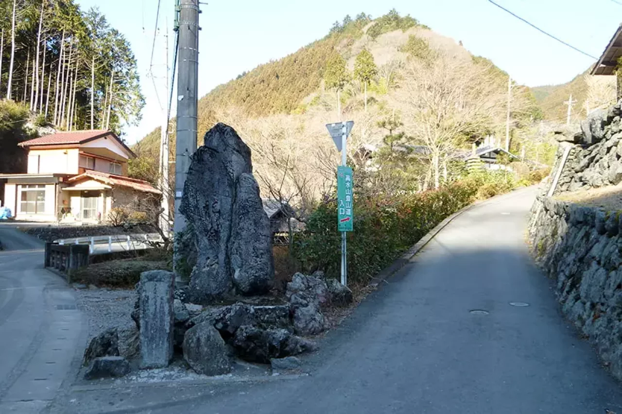 平溝川に平行してしばらく歩くと高水山登山道の入口を示す道標があるY字路に出ます。駅からここまで30分ほどです。右に入れば高源寺でこの先高水山まで急登が続きます。境内にはトイレがあるので利用しましょう。