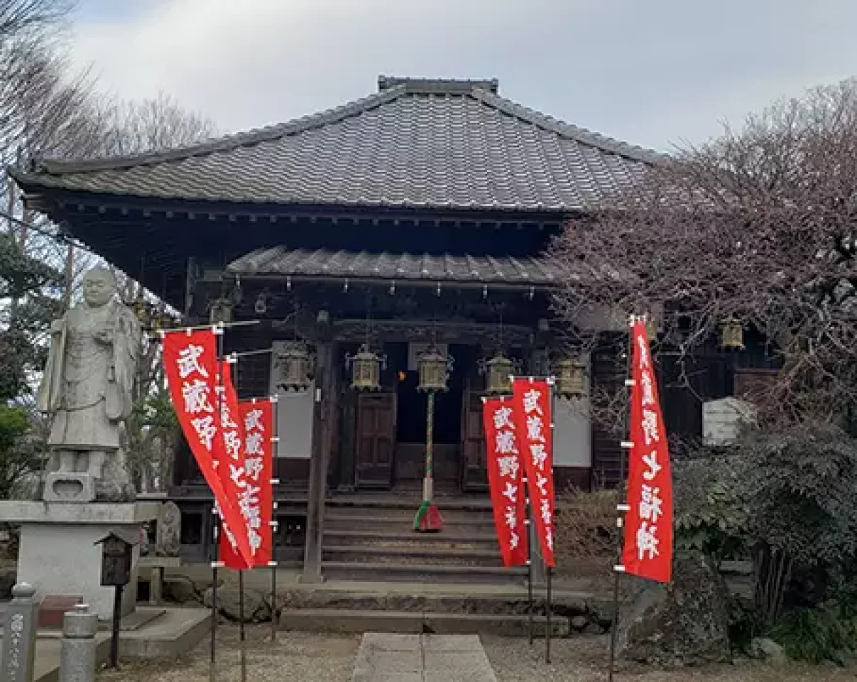 このコースのスタート、ゴールとも西武池袋線の飯能駅です。飯能駅北口を出て駅ビルの北側の車道を歩き、Y字路で右に進んで広小路交差点へと歩きます。交差点を左へ進み、仲町交差点を直進し、T字路で右へ。観音寺の境内に入ります。鐘楼に白い象が鎮座していることで有名なお寺です。