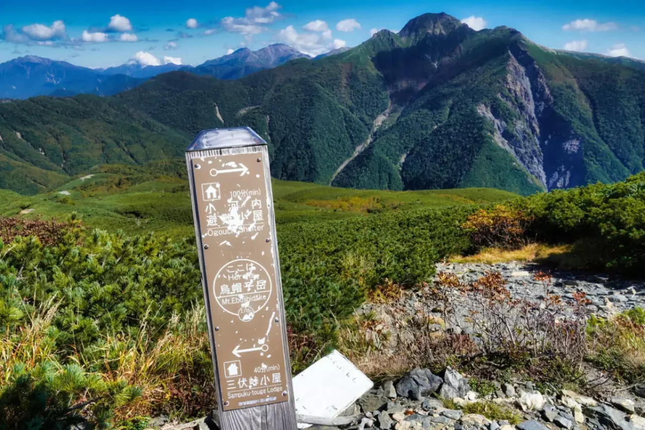 烏帽子岳付近から稜線に出ますが、寒くなってくるので防寒対策は必須です。烏帽子岳にも目印となる看板がありますので、見逃さないようにしましょう。