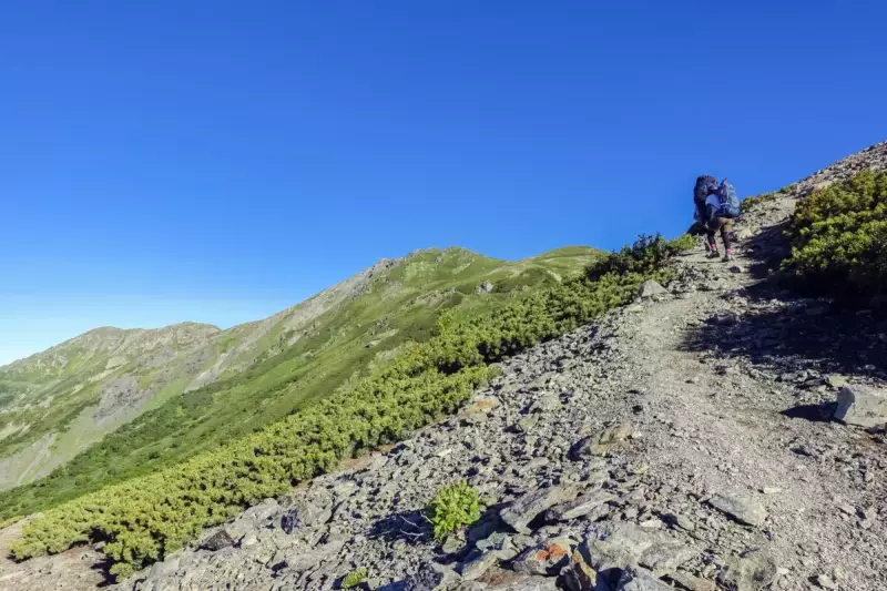 3日目は荒川小屋から出発し、見晴らしの良いハイマツに覆われた登山道を進みます。勾配の緩やかな、比較的歩きやすい登山道です。標高3000m付近の空中散歩を楽しみましょう。