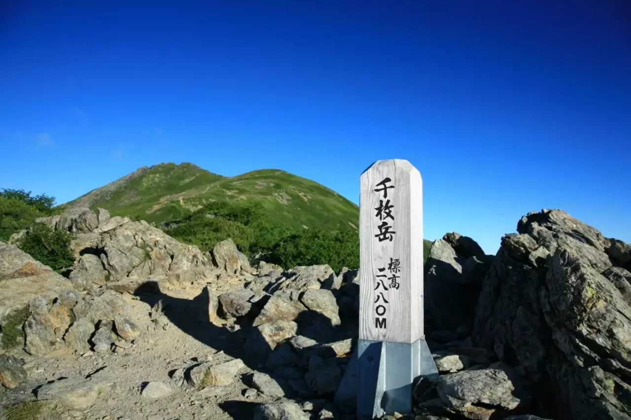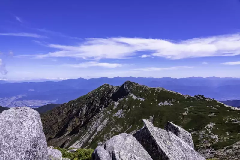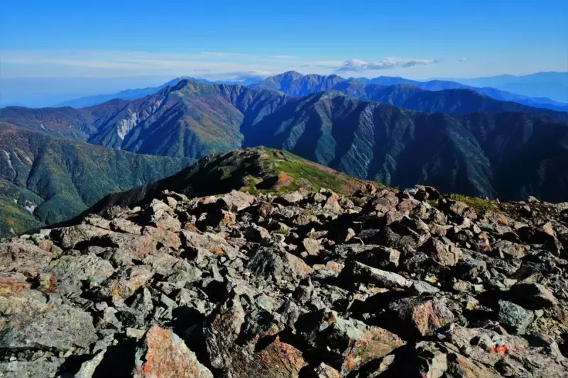 2日目は、まず千枚岳の山頂を目指します。はしごなども整備されていますが、岩場が多いため足元に気を付けて進みましょう。山頂からは、赤石岳など隣接する山々を臨むことができ、雄大な景色を楽しめます。