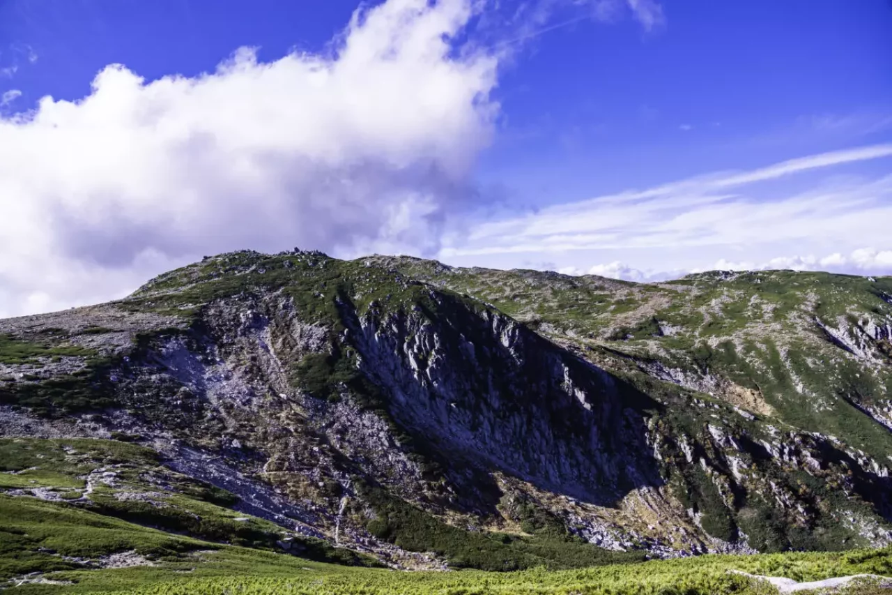 前岳は氷河地形の残る日本最南端の山です。南東にあるカールには、幅150ⅿ、長さ300mの岩石氷河が分布しています。発達したカール地形で、アルペンな雰囲気を楽しみましょう。