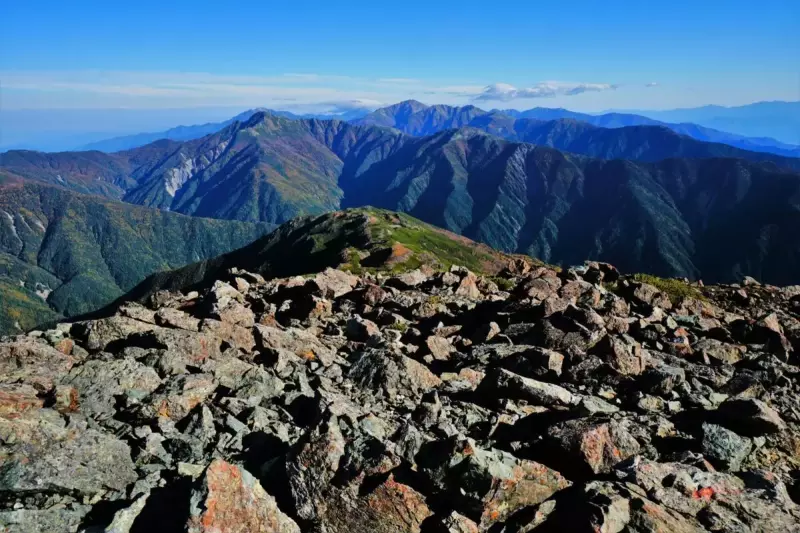 悪沢岳山頂からは、赤石岳や蝙蝠岳を見渡せます。悪沢岳山頂についたら、来た道を下って帰りましょう。