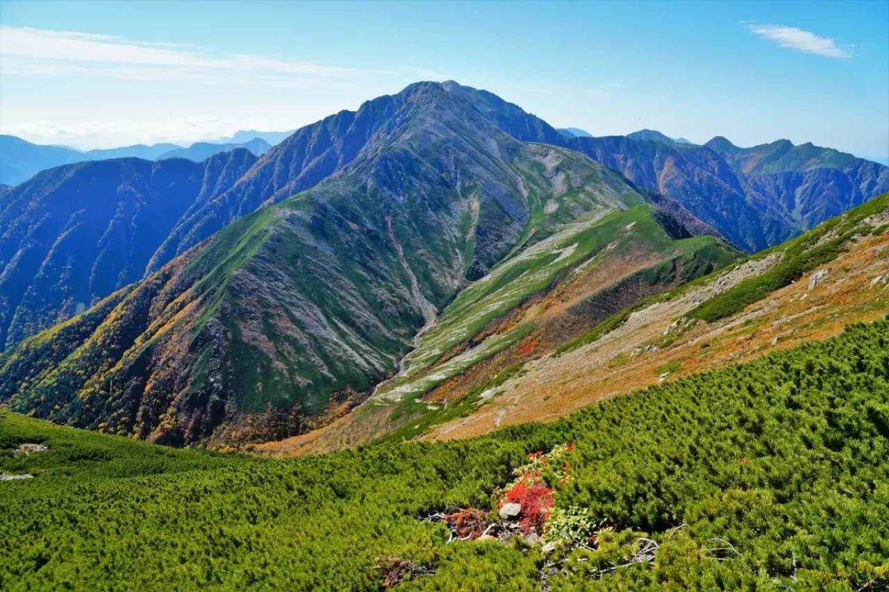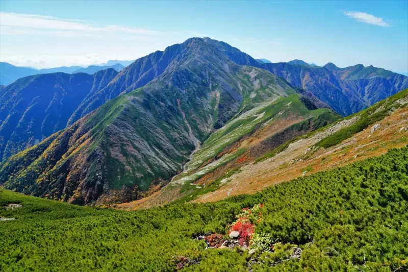 前岳から登山道の中継基地となる荒川小屋までは、高山植物の花畑が広がっています。南アルプスを代表する花畑で、青や黄色といった色とりどりの高山植物がみられます。秋にはナナカマドやダケカンバの紅葉が見事です。