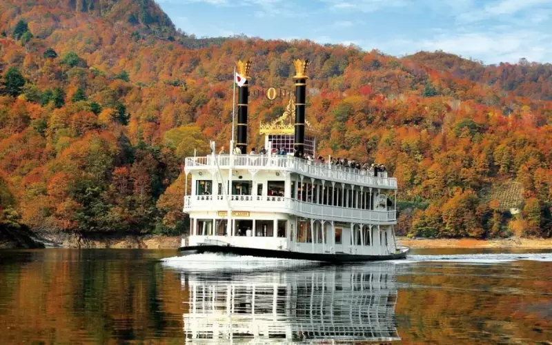秘境奥只見の2,000メートル級の山々に囲まれた、総貯水量6億トンという国内最大級の人造湖を巡る遊覧船。300人乗りの外輪船ファンタジア号はその姿も美しく、優雅に湖上を進みます。