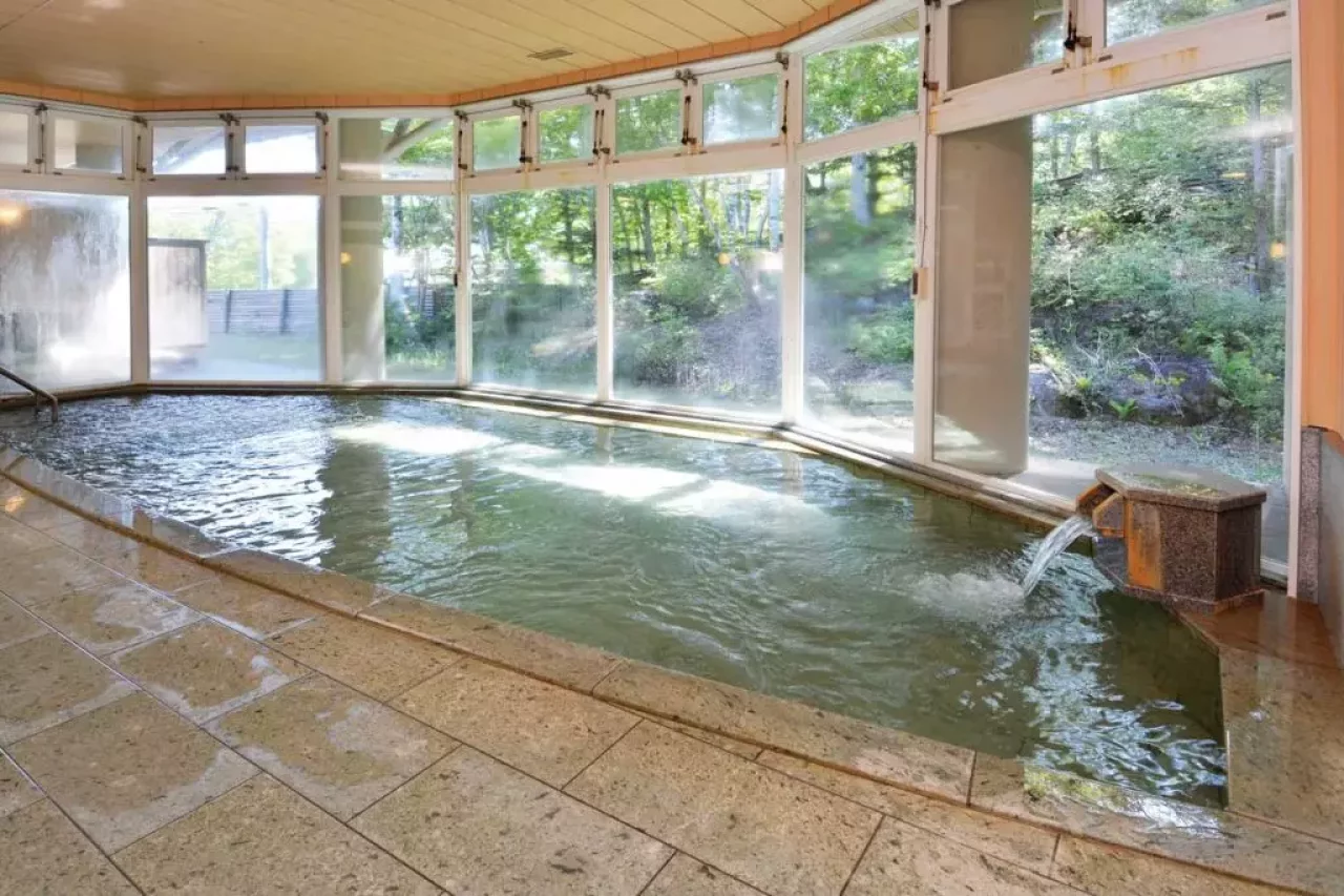 斑尾山の西面、標高835mに位置する天然温泉の日帰り入浴施設です。泉質は、アルカリ性単純温泉で、ぬるっとした肌にやさしいお湯になっています。大きな内風呂の他に、露天風呂もあり、高原の涼しい風に当たりながらゆっくりとした時間を過ごすことができます。