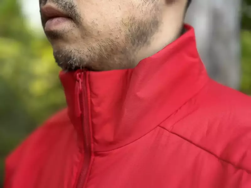 襟のデザインはしっかりと首を覆い隠す高さがあり、内側は首を優しく包む気持ちの良い起毛素材が使用されています。そして首の後ろに当たる部分は袖口と同様のストレッチ素材が取り付けられていて、着用した時に首の後ろ側から冷気の侵入を防ぎます。