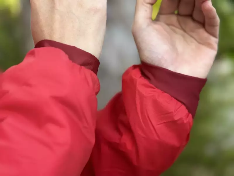 袖口にはベルクロテープなどがなく手首に優しくフィットするストレッチ素材が使用されています。このデザインや素材は他のアトムジャケットと同様で統一感があります。
