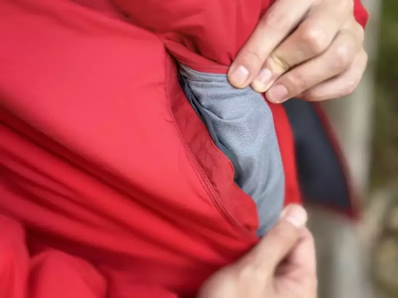 裾からの冷気の侵入を防ぐためにドローコードが備わっています。寒いと感じた時にすぐに裾部分を体に密着させることができるように、左右にコードエンドがついています。フィットさせた後、緩めることはさほどないと考えられたのか?長さ調整のためのコードロックは省かれてシンプルなデザインです。