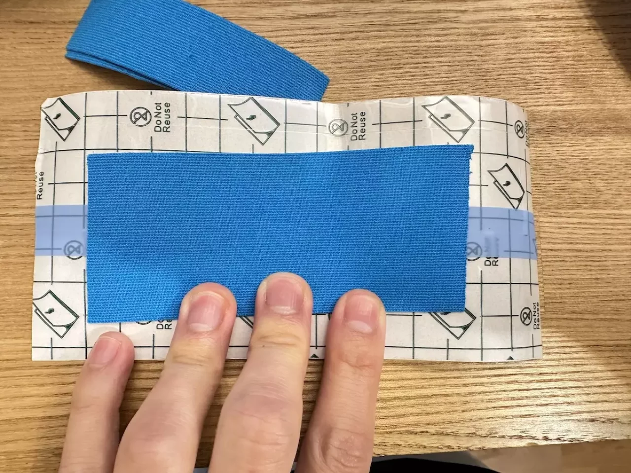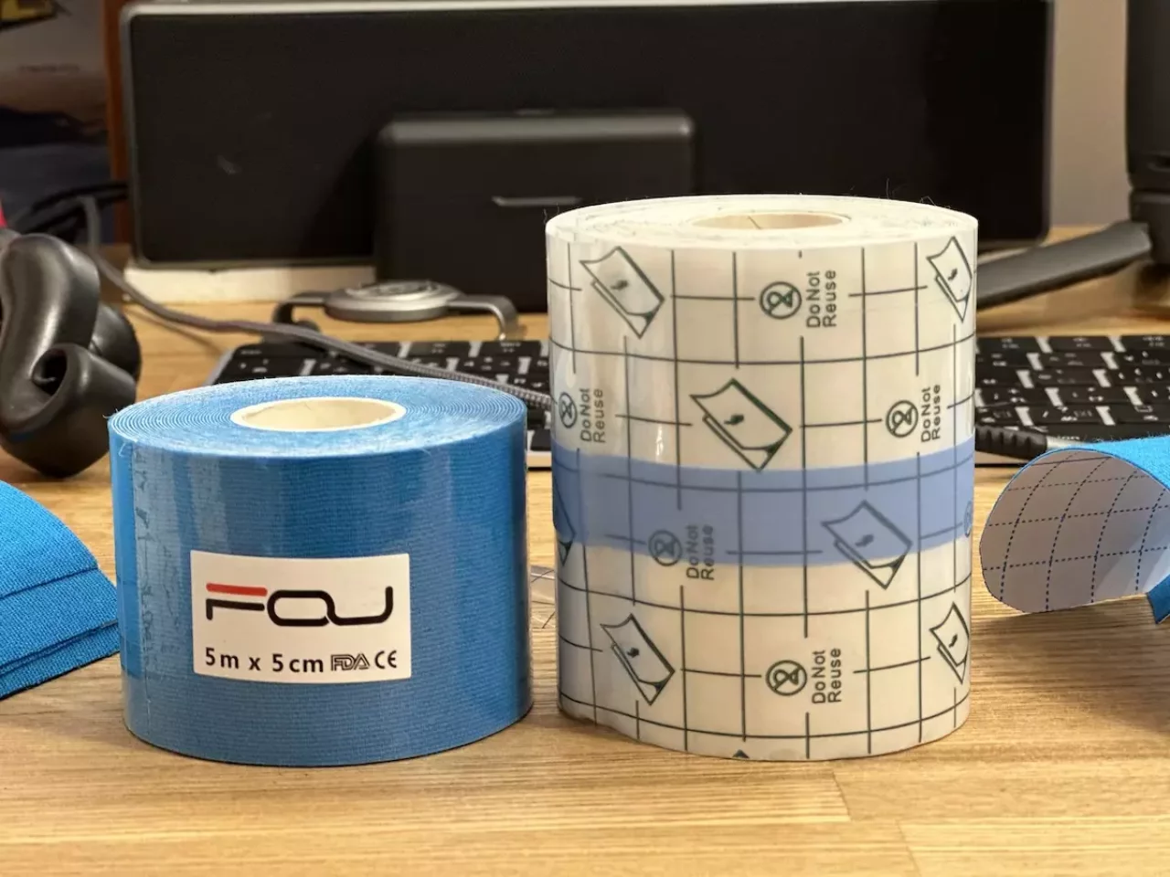 使用するのは伸縮性が高いキネシオテープと、医療用の防水フィルムです。どちらもロールで販売しているものを購入します。マメやスレ対策用のジェルパッドなどは1回の使用における単価が高いのに対し、今回紹介するキネシオテープと防水フィルムは様々な大きさにカットすることができる自由度と、1回の使用における単価が非常に安いことから気にせず使うことができます。