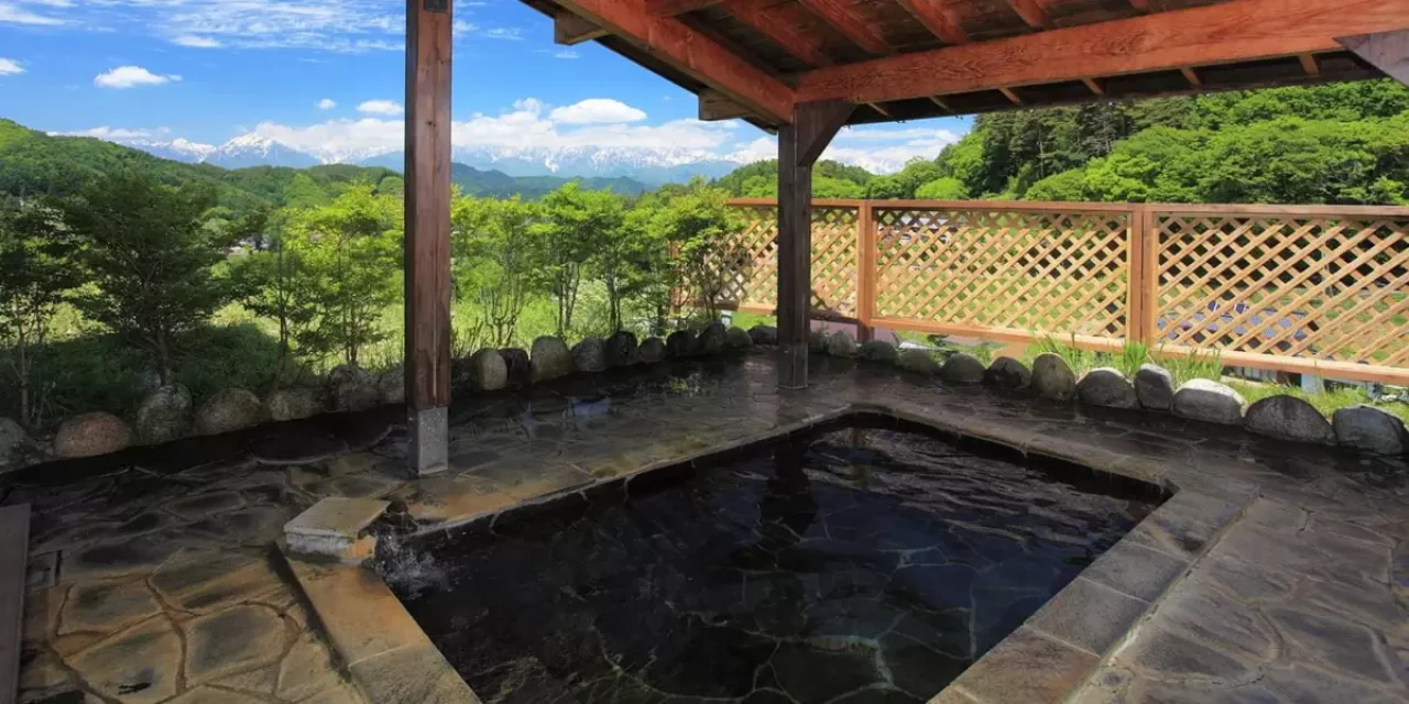 聖山の登山口・三和峠から、長野市大岡地区の方へ下り車で30分ほどの距離のところにある山あいの天然温泉です。聖山からは少し離れた位置にありますが、北アルプスの山並みを一望できる露天風呂は一押しです。