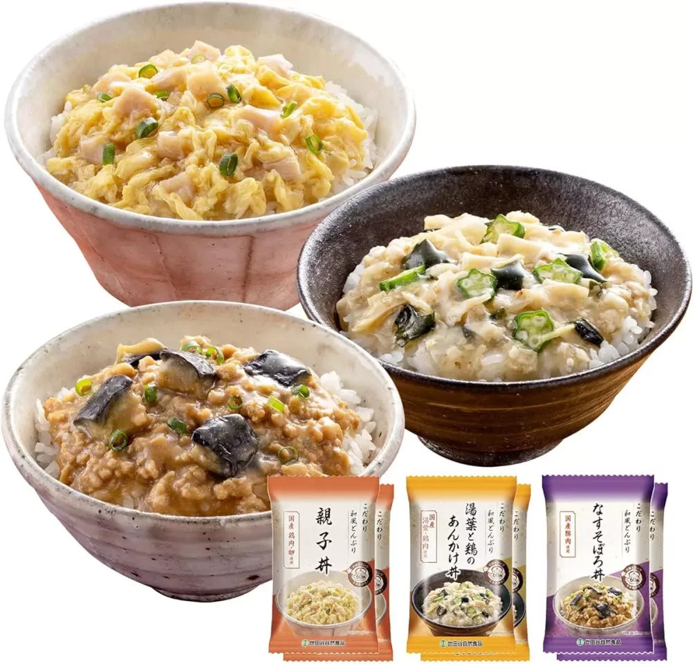 フリーズドライの丼物はアルファ米を豪勢なご飯にしてくれるのでよく利用しています。世田谷自然食品のフリーズドライは和風味で親子丼、鶏のあんかけ丼、なすのそぼろ丼の3種類がセットになって、野菜も結構しっかりした味わいでおすすめです。