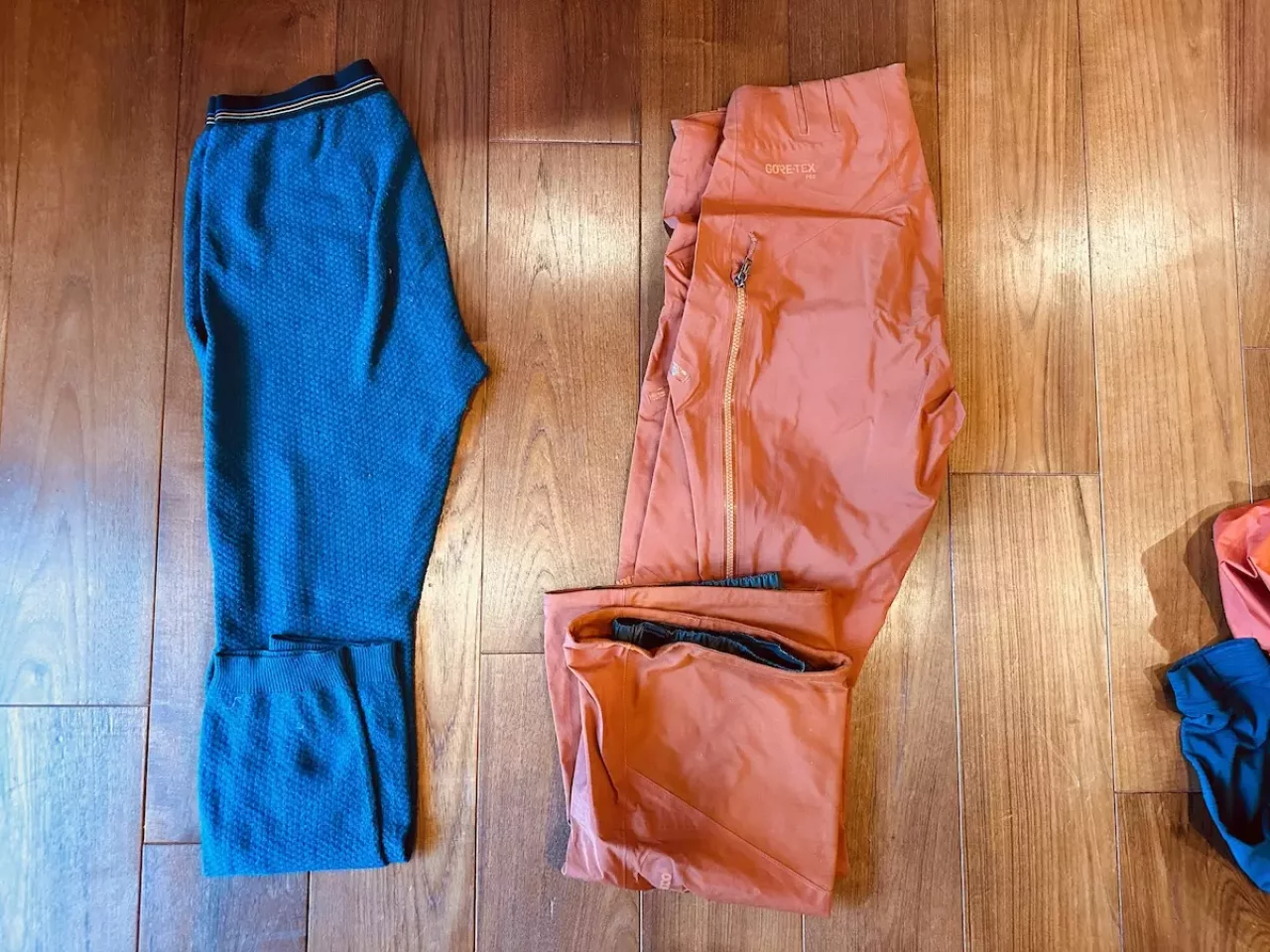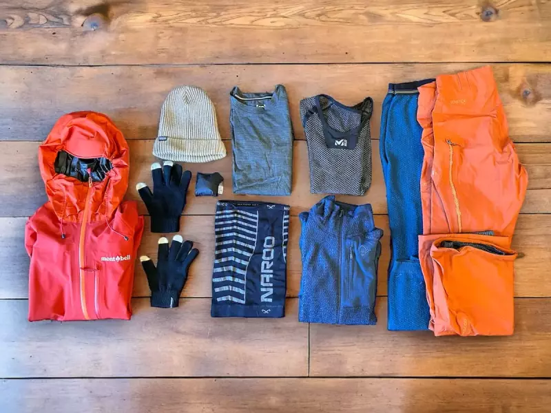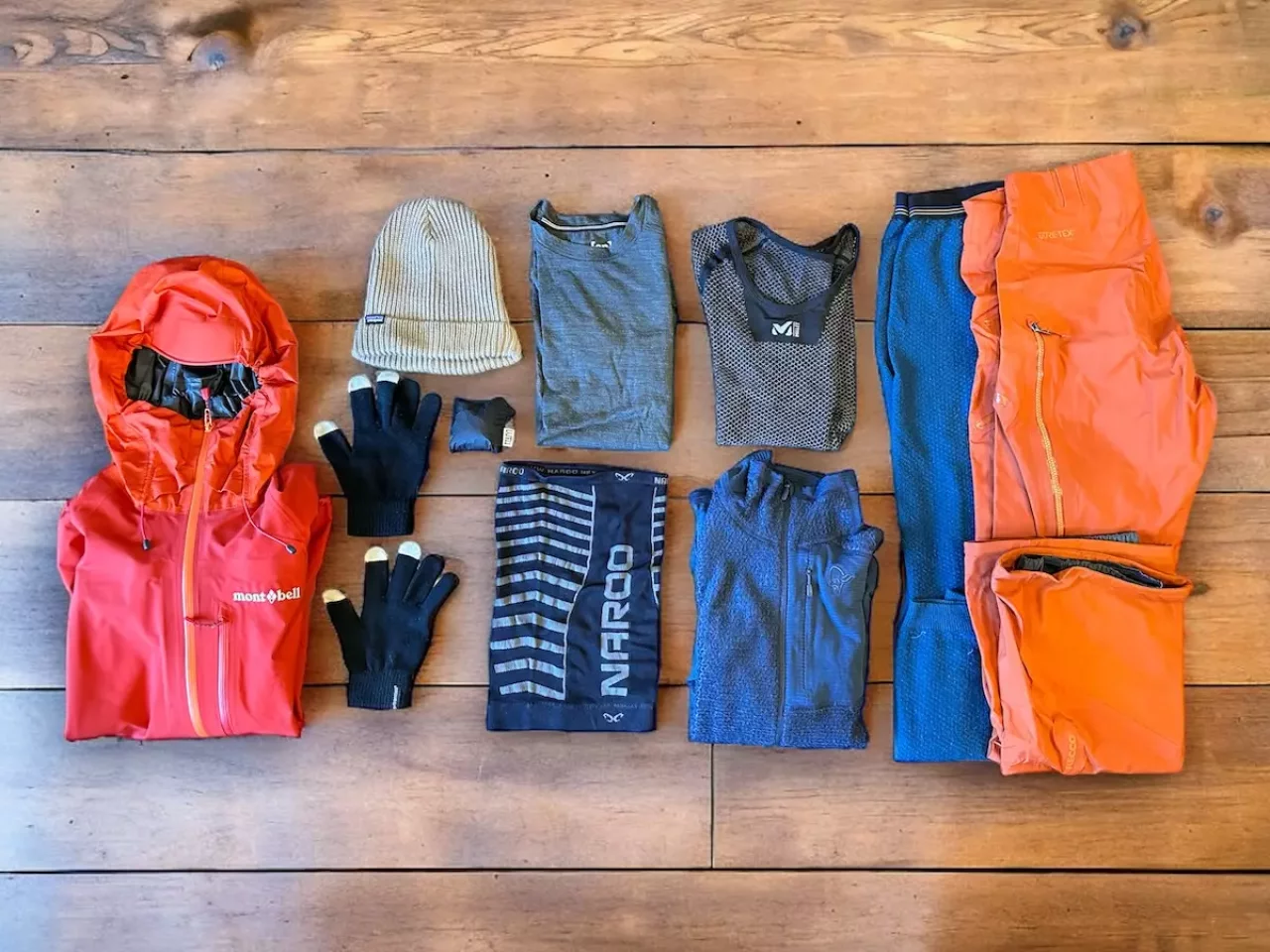 ズボンはハードシェルパンツを着用する場合は・タイツやサポートタイツの上にハードシェルというレイヤリングになりますが、ハードシェルを着用するには少しオーバースペックだと考えた場合は登山用ズボンを着用します。その場合レインパンツを別で装備に加えます。