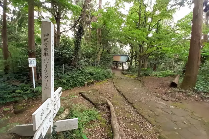 JR東逗子駅から神武寺という古刹を経て鷹取山へと至る、コースタイム1時間ほどのハイキングコースがおすすめです。東逗子駅から踏切を渡り、神武寺鷹取山登山口へ。登山道は苔むした古の参道です。神武寺の山門をくぐり境内に入ったら、左奥の登山道から坂道を登っていきます。