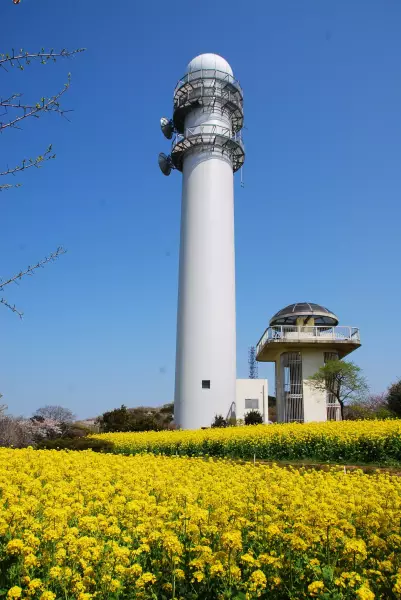 登山道に入ると野鳥のさえずりが聞こえ、気持のよい森林浴が楽しめます。国交省の白い観測レーダー塔のある辺りは花の絶景スポットで、季節によって菜の花やコスモスの可憐な姿が楽しめます。