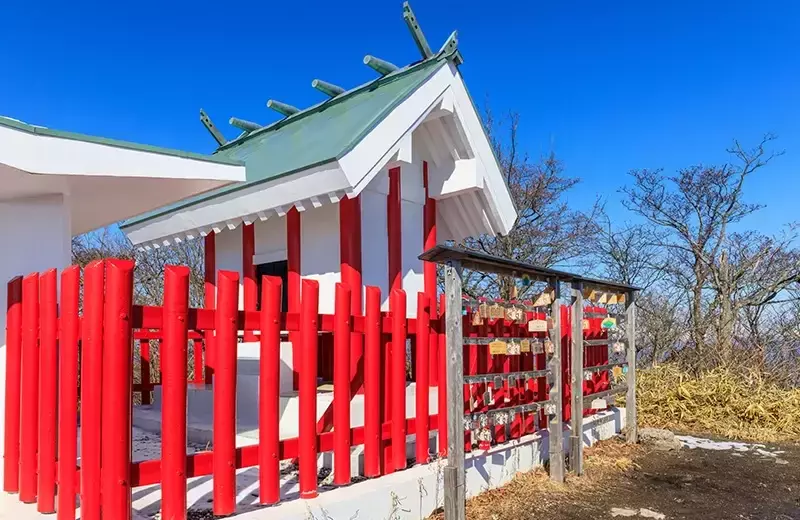 岩場を過ぎると菅原神社へ。そこからもう一登りで山頂に到着します。山頂には駐車場もあるので、車で登ることも可能。帰りは来た道をそのまま下山します。