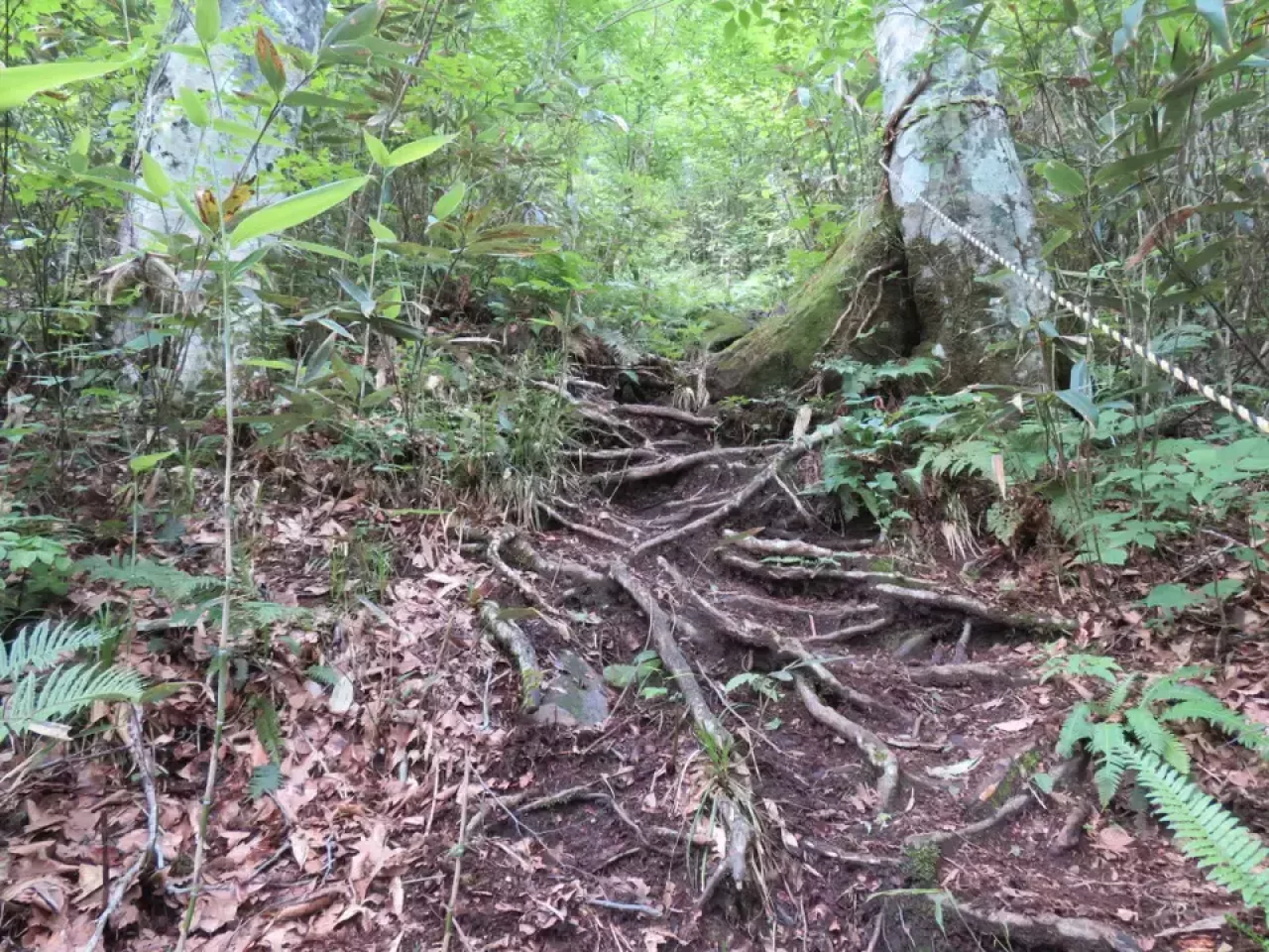 山頂結婚式の記念樹を過ぎ地獄坂へ。かなりの急こう配でロープを頼りに下りていきます。そして女岳坂と名前を変え少し傾斜は緩くなりますがますが坂は続きます。