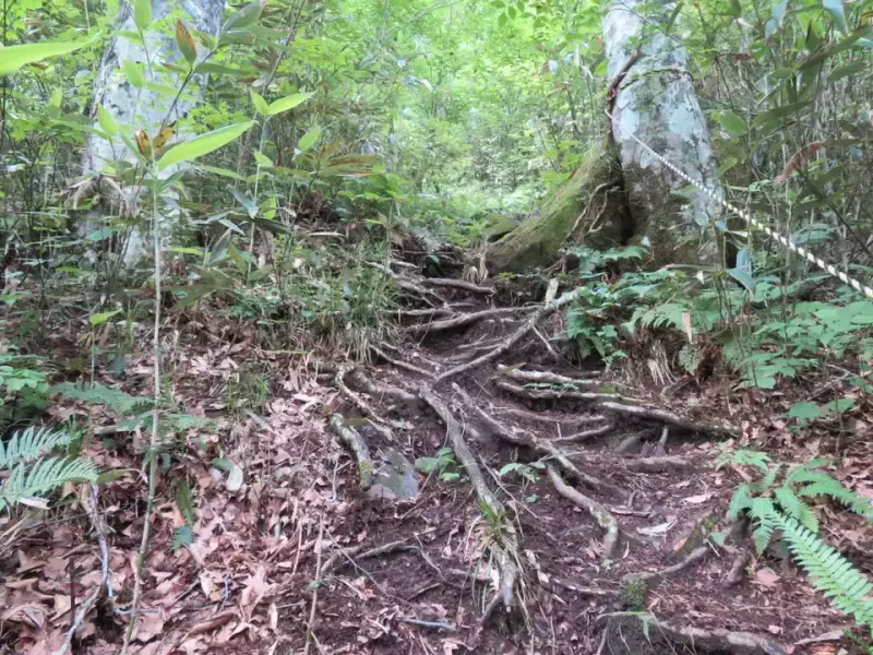 あすなろ坂を登りブナ平までは急斜面の連続。唯一平坦なブナ平で一息つけますが、山頂直下にはまたしても男岳坂という急登が待ち受けます。距離は短いですがかなりきつい急斜面ですから呼吸を整えてから挑みましょう。
