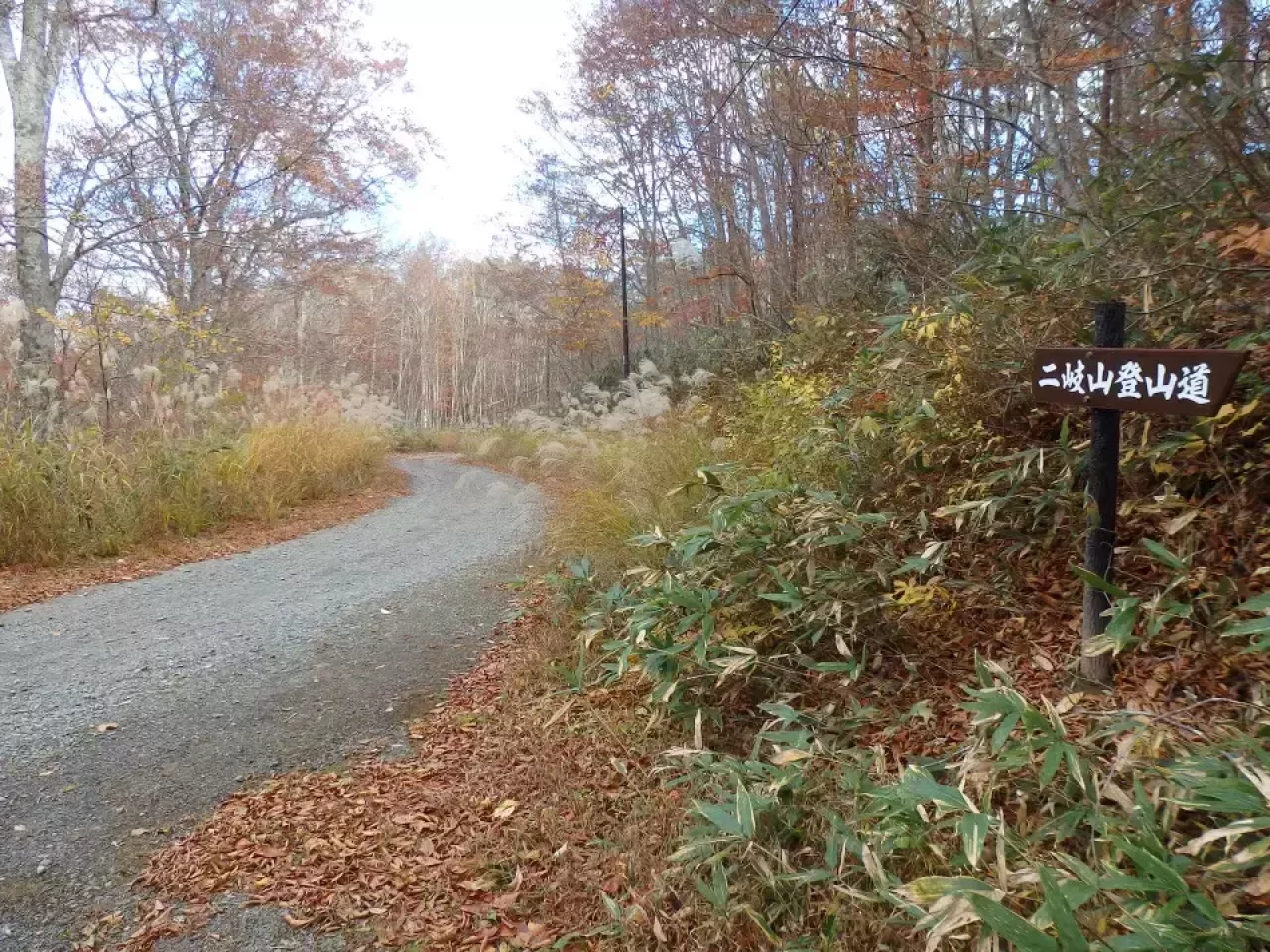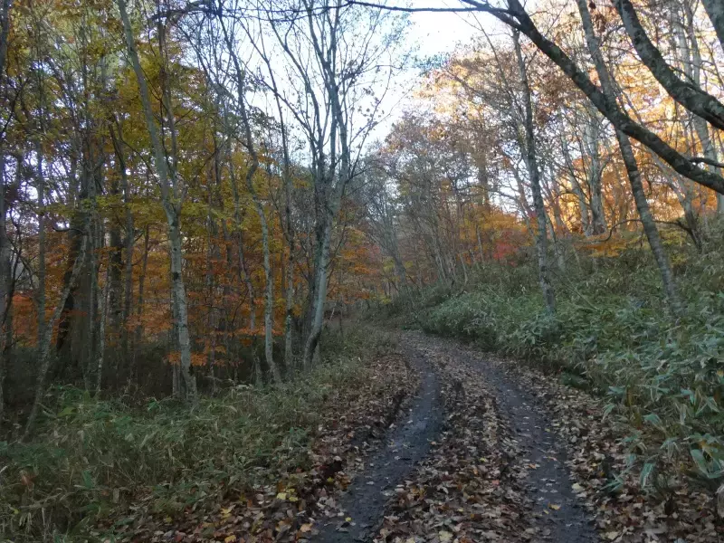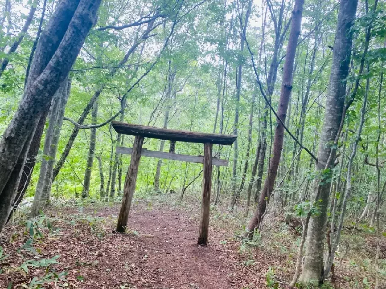秋以降は、積もった枯れ葉で足元が滑りやすくなっていますので注意が必要。きれいなブナ林の中を進むと二岐明神の鳥居をくぐったらまもなく風力発電登山口に到着です。