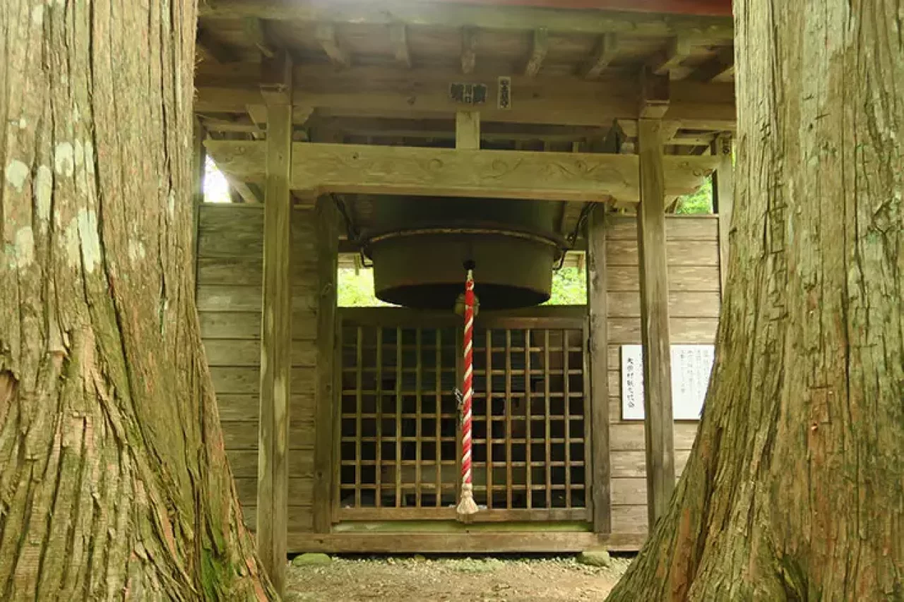 御鍋神社を見守るかのようにそびえ立つ樹齢500年の2本のサワラ。平成12年に林野庁が選んだ国内100か所の巨木「森の巨人たち100選」に選定されています。
