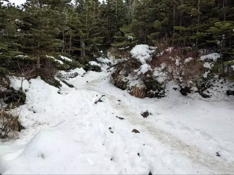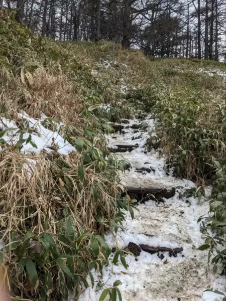 たいして標高は高くないのですが、場所的に日が当たらないのか少し前に降った雪が凍りついているようですね。