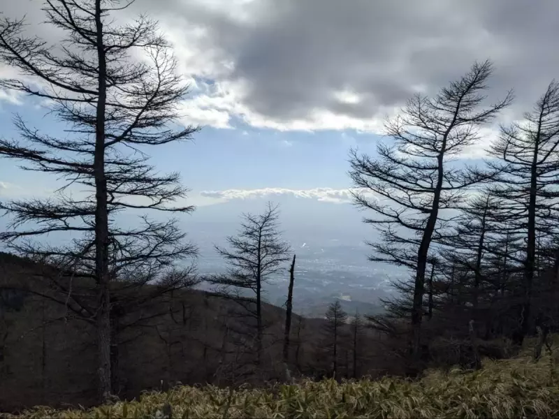 登山開始から1時間くらい歩くと浅間山がちらりと顔を出しました。