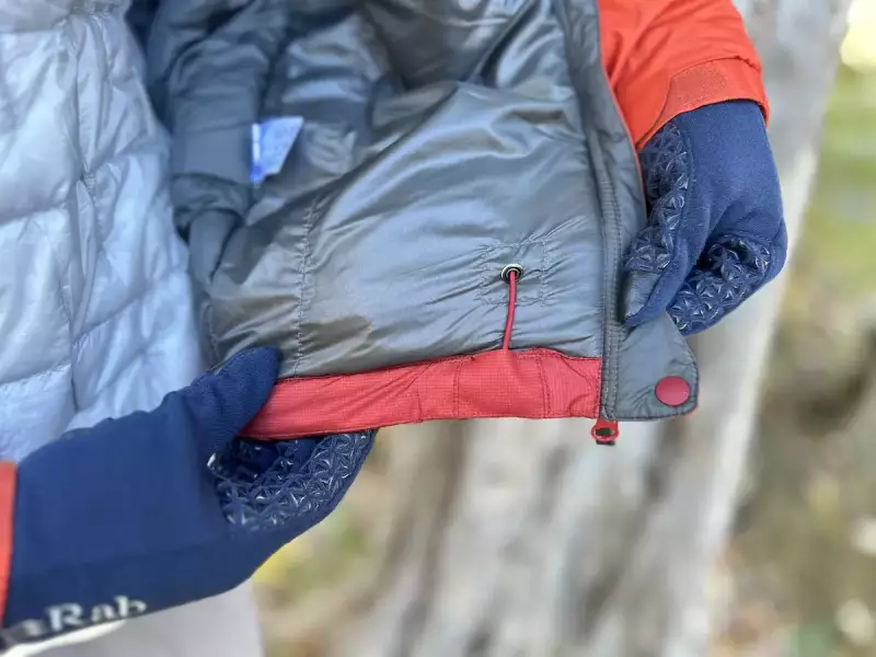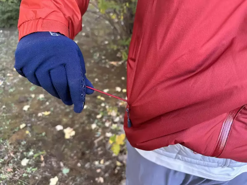 裾部分のフィット調整は裾の中に内蔵されたコードロックのボタンを押しながら引っ張る必要があり、両手を使う必要があります。またグローブをしたままだとコードロックのありかを見つけづらく、またポケットの中にグローブをした状態でドローコードの先端を見つけづらいため、個人的にはコードは外に出ている方が使いやすいと感じます。