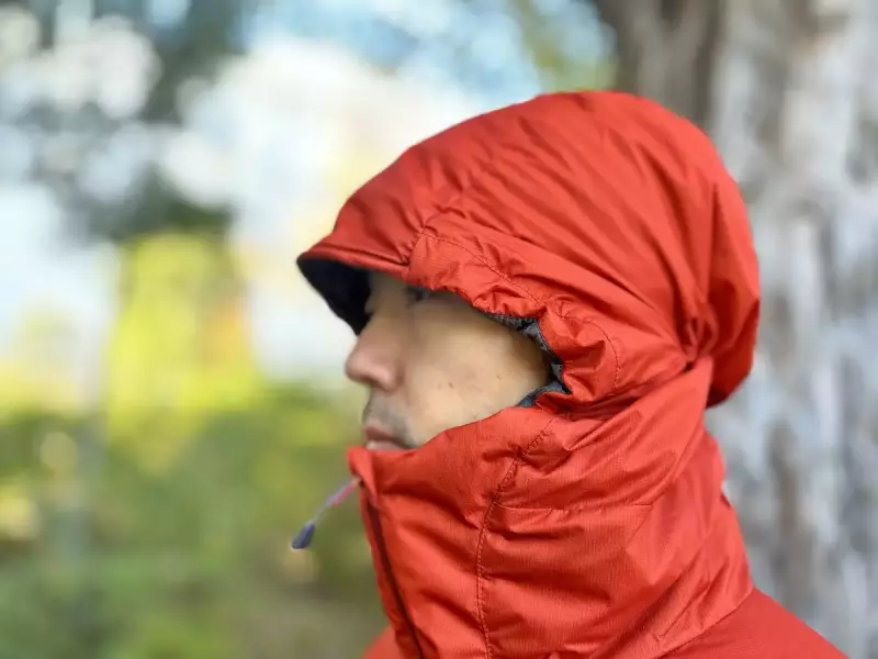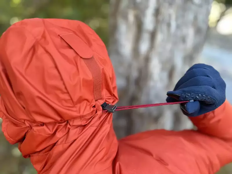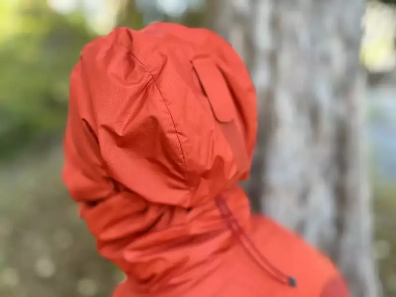 フードはヘルメットをした状態でも被ることができ、ヘルメットをしていなくてもしっかりと顔にフィットし、さらに視界を妨げないようにベルクロテープが後頭部に備わっています。フードの周囲のフィットはジャケットの内側に設けられたコードを、襟の中に設けられたコードロックボタンを押しながら調整します。フロントジッパーを開けないと調整できないのは寒い場所や季節においては使いづらく感じます。