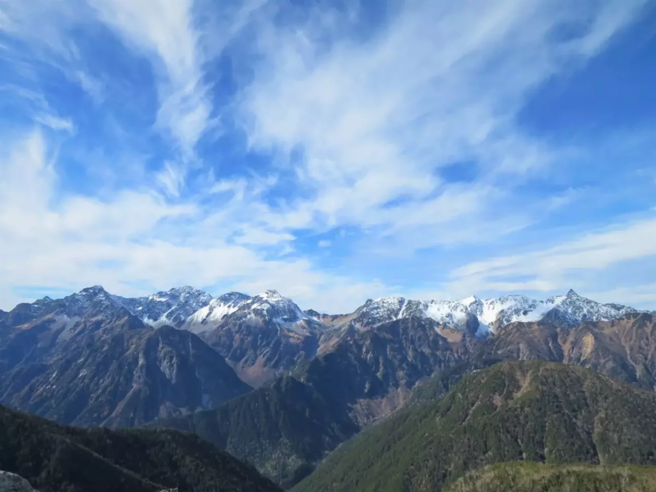 前穂高岳の山頂からは、険しい北アルプスの山並みを一望できます。微視穂高岳や岩の要塞と呼ばれるジャンダルム、奥穂高岳、北穂高岳が続き、奥には天をつきさすように槍ヶ岳がそびえています。