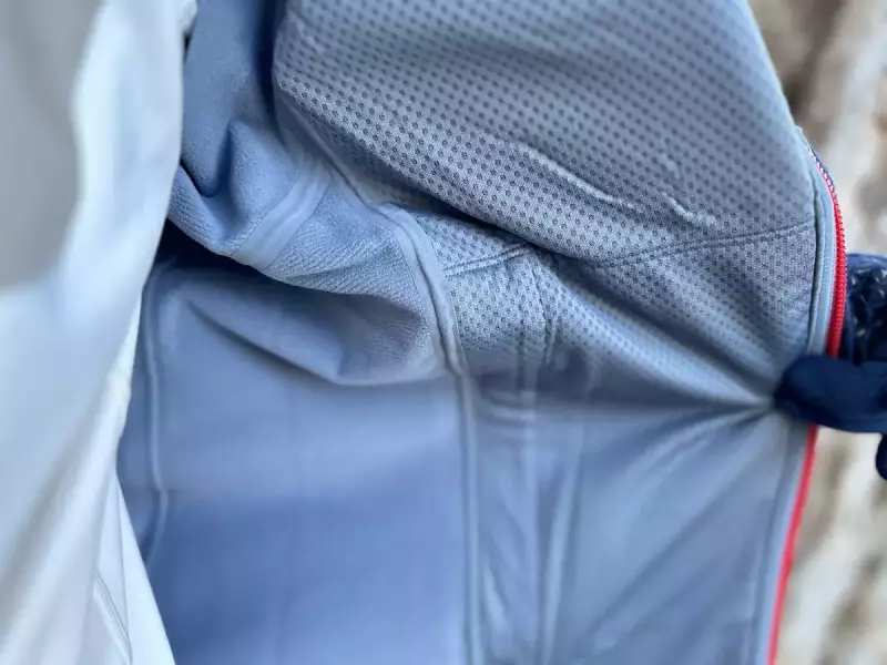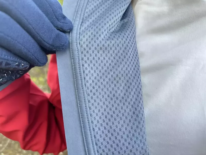 裏地は襟と袖から脇、背中には柔らかい起毛素材で程よく保温し、風がダイレクトに当たる前身頃には、メッシュ素材が張り合わされ防風性を高めています。