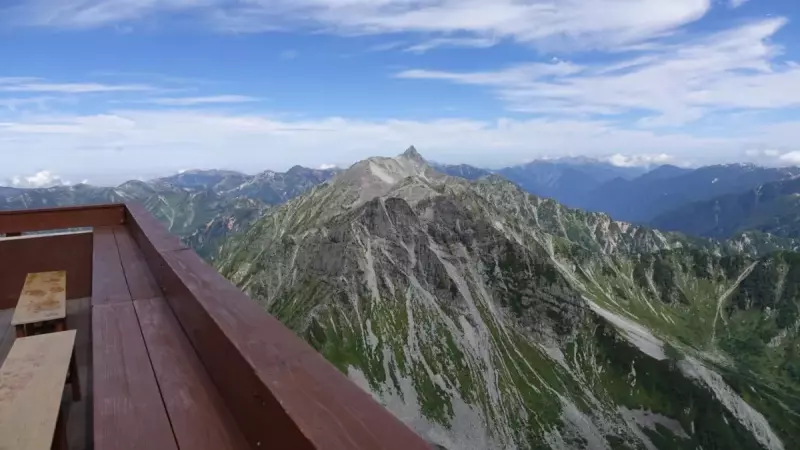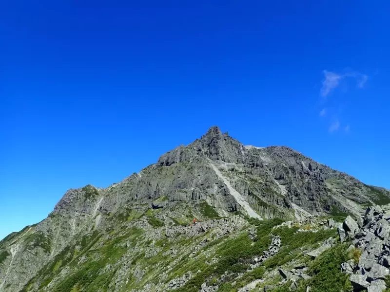 北穂高岳山頂の見どころは、北方に浮かぶ点を突き刺すような槍ヶ岳の立ち姿と、大キレットを一望できる360℃の大パノラマです。南方には手前に奥穂高岳、奥に前穂高岳が連なっています。