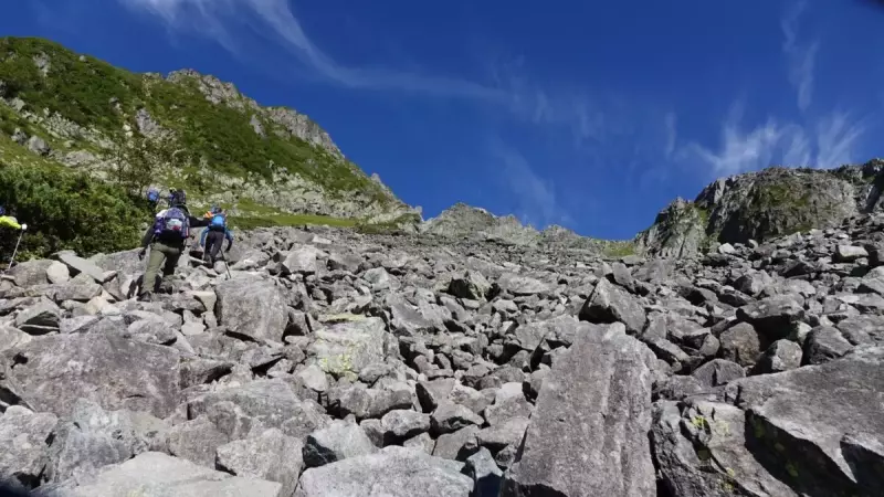 涸沢小屋の右手に北穂高岳へ向かう登山道があります。ハイマツ帯を登っていった先には北穂高岳らしいごろごろした岩場です。