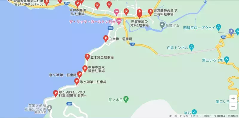 中禅寺湖東岸の立木観音前にある県営の無料駐車場です。