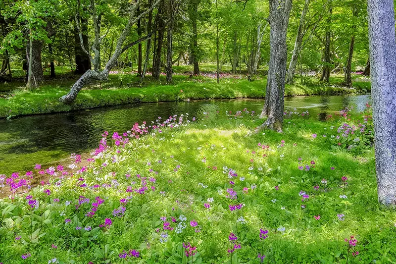 湖面は透明度も高くおだやかで、湖畔を歩けばさわやかな風が吹き抜けます。湖畔の千手が浜には白やピンクの花弁がかわいいクリンソウの群生を観ることができます。