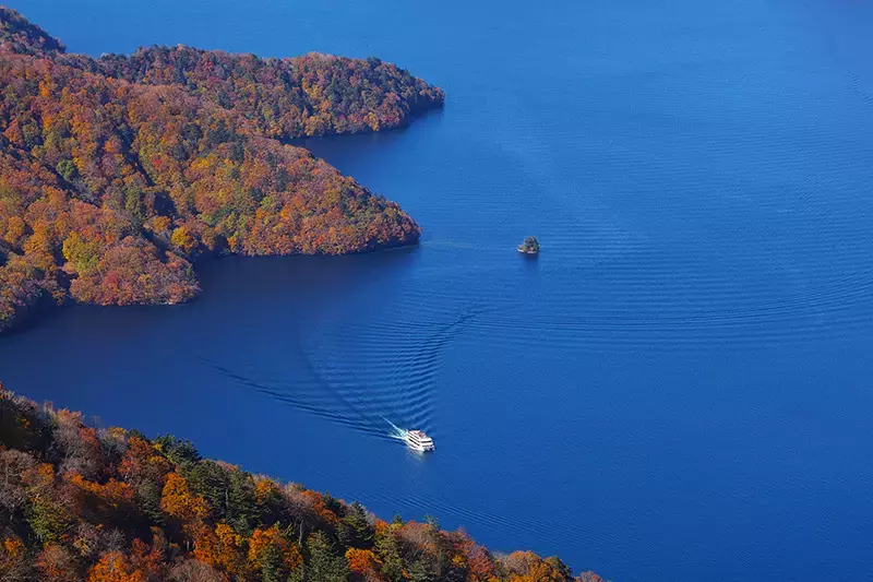 紅葉の名所である細長く出っ張った八丁出島。日光開山の祖、勝道上人の遺骨が納められている上野島とクルーズ船が描く航跡波。もうどこを見ても絶景の連続です。