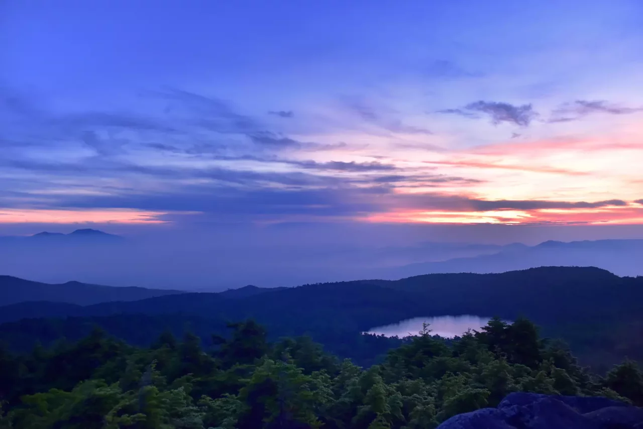 荷物をデポしたら高見石展望台へ。ここから見える白駒池と薄明どきの光景は美しく、感動的です。
