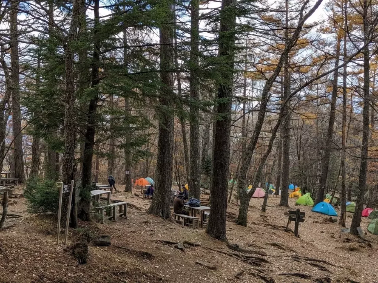登山口からテント場まで歩いて50分程度と、重いザックを担いで歩く時間が短い上、テント場の面積が広く、樹林帯の中にあるため木々に守られて風の影響を受けにくいのが初心者におすすめの理由です。