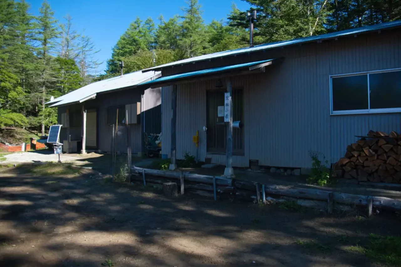 大弛小屋のテント場は、日本車道最高所の峠である大弛峠のすぐそばにあり、標高2365mに位置しています。管理している大弛小屋は、丸太作りで昔ながらの「the山小屋」といった趣。テント場は大弛小屋駐車場横の林の中にあります。