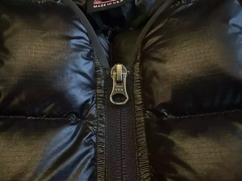 フロントジッパーはYKKのリバースコイルジッパーでジッパーが勝手に開くのを防ぐロック機能付きのスライダーを備えています。