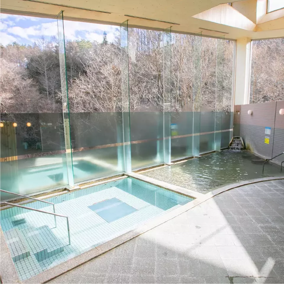 天狗山縦走コースの登山口、馬越峠から北側の南相木村に下ってすぐのところにある温泉施設です。山奥の地域にある共同浴場で、犬ころの滝という滝のすぐ横に位置しています。全面ガラス張りの内湯や周囲の山々に囲まれた露天風呂からは、山あいの村の大自然を肌で感じることができます。
