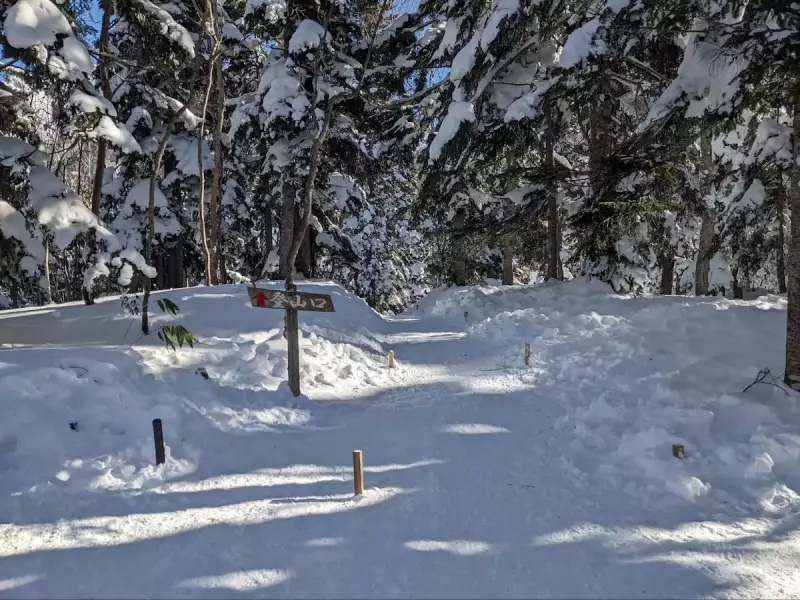 名物の巨大雪だるま。ここから西穂丸山まで20分程度、奥の小高い登りに向かいます。