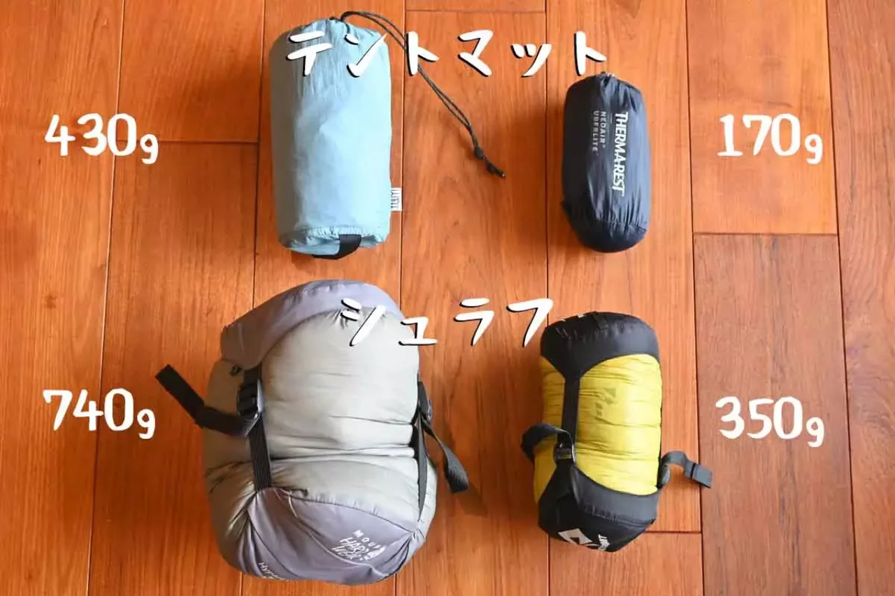 | シュラフ | マウンテン・ハイパーラミナスパーク | 740g | シートゥーサミット・スパークSP1 | ¥30,250 | 350g | 390g | ¥77 |