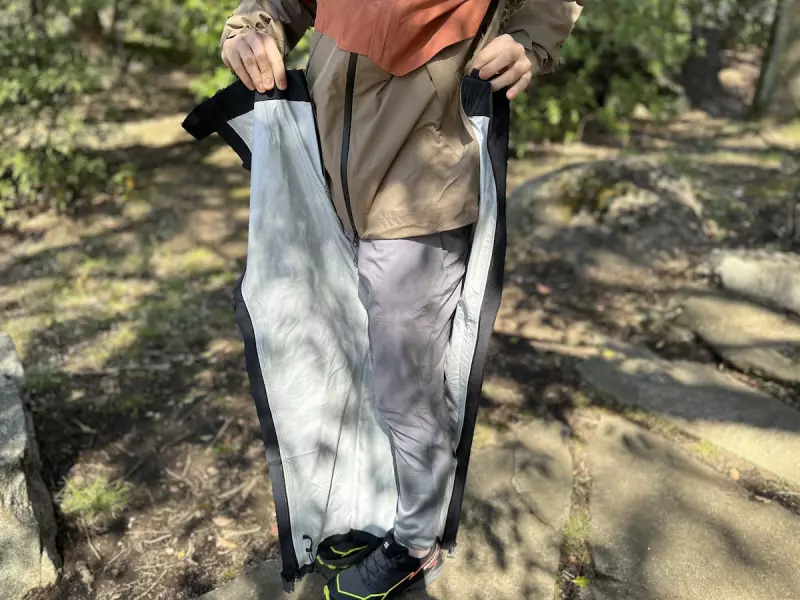 だからレインパンツを着用する時は登山靴を脱ぎ履きする必要がなく、またパンツに足を通す必要がないので、レインパンツが登山口の泥で汚れることもありません。トレイルランニングのようなシューズでも、ハイカットやミドルカットなどの登山靴でも気にすることなく脱ぎ履きが可能なレインパンツです。
