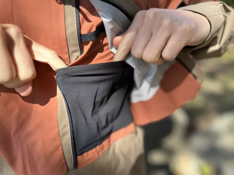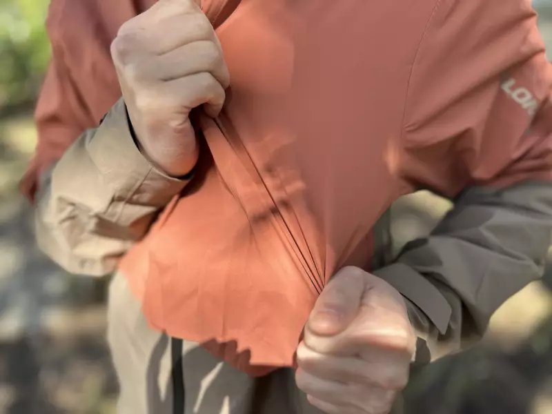 このレインジャケットは高い通気性を兼ね備えていながら、ピットジップを備えています。そしてこのピットジップはダブルジッパーなんだけれども、ジッパーが閉まった状態にある時に、上部と下部にジッパータブが位置するデザインです。これによって腕側もしくは脇下側の通気確保を素早く行うことができ、開ける時にジッパーが重ならないので、開け閉めを容易に行うことができます。今後この形がスタンダードになる予感がします。
