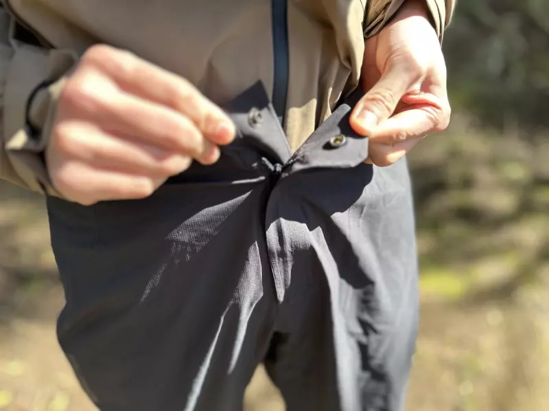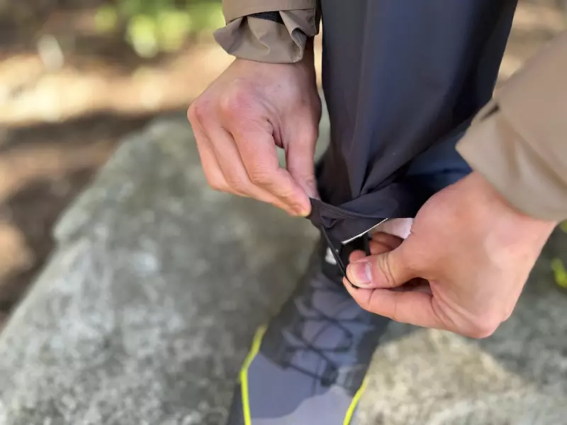 裾の部分は内側に設けられたドローコードを調整することで、裾を絞ることができます。だから素早い行動時には足元を視認しやすく、また木や枝にレインパンツが引っかかるような心配も少ないデザインです。