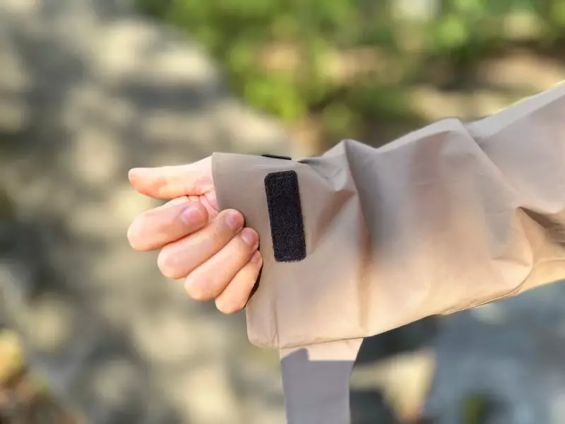もう1つすごいのが採用しているコードロックと先端のプラスチックハードウェアです。見た目なんてことのないものなのですが、コードを引っ張るだけで素早くフィットさせることができ、緩めるのはコードロックのボタンを押すだけという、全て片手で完結させることができます。これは実際に雨の中を素早く行動してる時に、かなり使い心地が良くめちゃめちゃ気に入ってるポイントの一つです。