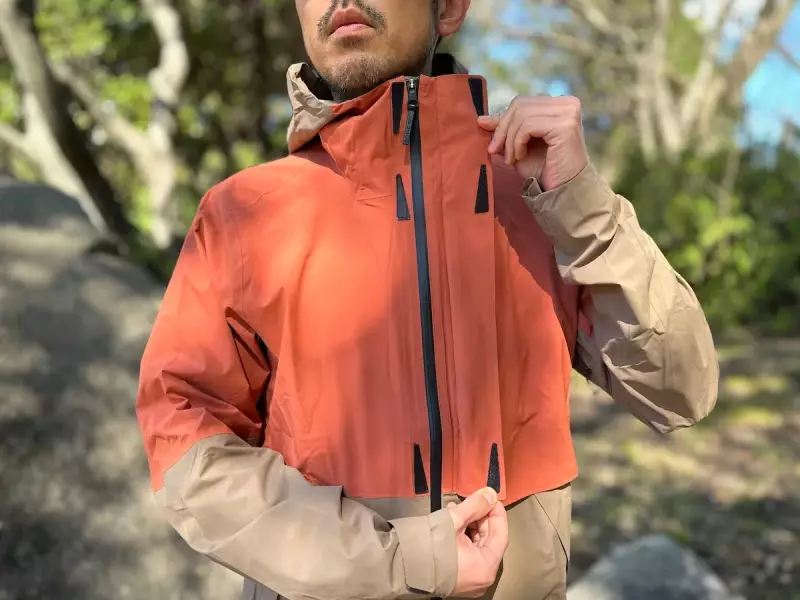 フロントジッパーはダブルジッパーで止水ファスナーです。雨が降った状態でフロントジッパーからの通気を確保したい時に、フロントジッパーをお腹の上あたりまで下げて、色が変わっているジャケット上部にはベルクロテープが備わっているのでこのテープを閉めてあげれば隙間から通気を確保することができます。
