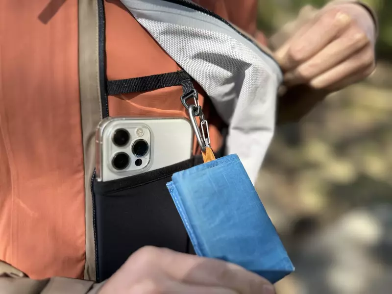 メッシュポケットはストレッチ性が高いのでスマートフォンを収納して固定しておくことが可能で、僕が持っているiPhone14Proを無理なくストレッチポケットの中に入れることができます。