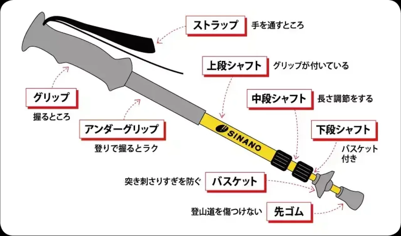 | 下り | 下りではポールをやや長めに調節する。 足を着くより先に、前方にポールを突くことで、足腰にかかる負担を軽減できる。 バランスも取りやすくなるため、転倒のリスクを減らせる。 |