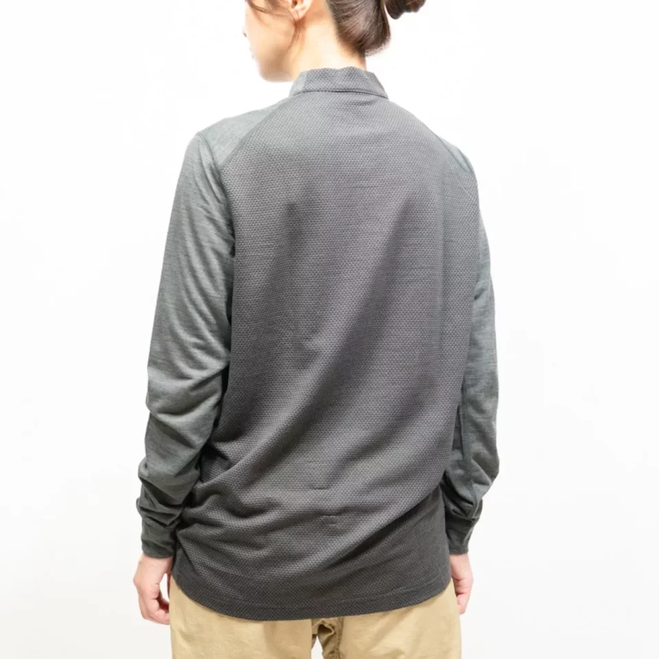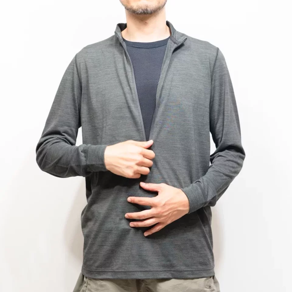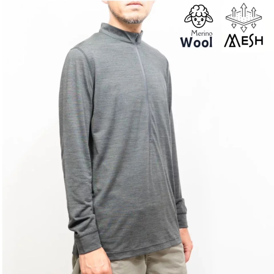 【山旅】バックメッシュ・速乾メリノウール・ジップアップ・ロングスリーブシャツ(ユニセックス)| 発汗量の多いアクティビティでも快適なべースレイヤー